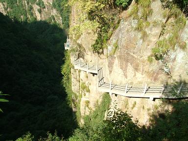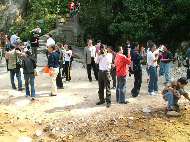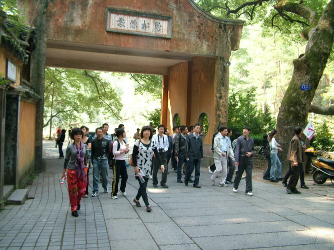 10月17日,老師們首先參觀了國清寺。國清寺坐落在浙江省臺州市天臺縣華頂山麓,是我國著名古剎之一,被中、日兩國佛教奉為發(fā)祥地,距今己有一千四百多年歷史。五峰聳峙、雙澗縈流。大雄寶殿前的銅鼎爐,爐高4米多,為清代所鑄;大雄寶殿內(nèi)正中的蓮花寶座上端坐著釋迦佛銅像,蓮座高6.8米,重13噸,為明代所鑄。無論是銅鼎爐還是釋迦佛銅像,工程之大,做工之精細(xì),都超乎想象,引起金屬材料所各位老師的關(guān)注,并引發(fā)一場深刻的討論。“人間古剎越千年”,廊檐禪門之中,體現(xiàn)著古人的深邃與睿智,巍然挺拔的隋塔還有千年不老的古梅,讓老師們不禁嘖嘖稱奇。下午接著參觀了石梁飛瀑。石梁飛瀑不比其他瀑布壯觀,但有其獨特之處。一條二丈左右的天然石梁橋,橫跨兩側(cè)險峻懸崖之間,微微拱起的梁面,仿佛一條匍伏的巨蟒,左右而來的兩條溪水激起浪花萬朵,飛流直下,真有“滄海平翻龍背上,銀河倒瀉雀橋東”之勢。著名的品牌啤酒“紅石梁”就是以此命名的。在這青山秀水之間,老師們拋下了一切塵世煩惱,留下了一張張美麗而純真的笑容。
