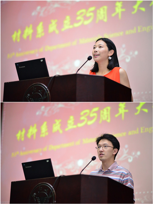校博士生會原副主席高倩和2012年竺可楨獎獲得者路宜作為學(xué)生代表發(fā)言,他們傳達(dá)了學(xué)系全體在校生的心聲。他們表示,每個材料學(xué)子的人生都與學(xué)系輝煌的歷史和璀璨的未來緊密地聯(lián)系在一起,他們必將不懈努力,使自己成為具有國際視野的未來材料領(lǐng)域領(lǐng)導(dǎo)者,為材料系美好的明天貢獻(xiàn)自己的一份綿薄之力。