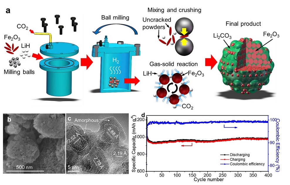 過(guò)渡金屬氧化物作為鋰離子電池負(fù)極材料具有儲(chǔ)量豐富、成本低廉、環(huán)境友好、安全性能高和抗腐蝕能力強(qiáng)等優(yōu)點(diǎn),近年來(lái)備受人們的關(guān)注,但其較差的循環(huán)穩(wěn)定性和低的庫(kù)倫效率阻礙了實(shí)際應(yīng)用。納米化和碳復(fù)合是改善過(guò)渡金屬氧化物負(fù)極材料的有效途徑,但這些方法分別存在制備困難、體積儲(chǔ)能密度下降等缺點(diǎn),不利于大規(guī)模商業(yè)化應(yīng)用。針對(duì)這些問(wèn)題,浙江大學(xué)材料學(xué)院金屬材料研究所、硅材料國(guó)家重點(diǎn)實(shí)驗(yàn)室、浙江省電池新材料與應(yīng)用技術(shù)研究重點(diǎn)實(shí)驗(yàn)室劉永鋒教授和潘洪革教授與浙江大學(xué)電鏡中心田鶴研究員、華南理工大學(xué)材料學(xué)院朱敏教授合作,通過(guò)在CO2氣氛下球磨LiH和Fe2O3的混合物,利用Fe2O3、LiH與CO2在機(jī)械化學(xué)力作用下的氧化還原反應(yīng),成功在納米晶Fe2O3(10 nm)表面共形包覆了一層1-3nm的Li2CO3層;同時(shí),由于球磨過(guò)程重復(fù)的破碎和冷焊作用,共形包覆的Fe2O3進(jìn)一步團(tuán)聚為亞微米顆粒(400-800 nm),這種共形包覆和分級(jí)結(jié)構(gòu)共存的納米晶Fe2O3具有良好的循環(huán)穩(wěn)定性能和高倍率放電性能,其在100 mA/g的放電電流密度下,400個(gè)循環(huán)后的容量保持在975 mAh/g;在3000 mA/g的放電電流密度下,其放電容量達(dá)537 mAh/g,明顯高于未包覆的納米Fe2O3顆粒(311 mAh/g)。該分級(jí)、共形包覆技術(shù)具有制備過(guò)程簡(jiǎn)單,可控性好,效率高等優(yōu)點(diǎn),更重要的是,其可以擴(kuò)展到NiO等其它過(guò)渡金屬氧化物負(fù)極材料上,呈現(xiàn)出一定的普適性。這一研究成果為發(fā)展高容量、長(zhǎng)壽命型過(guò)渡金屬氧化物鋰離子電池負(fù)極材料奠定了基礎(chǔ)。