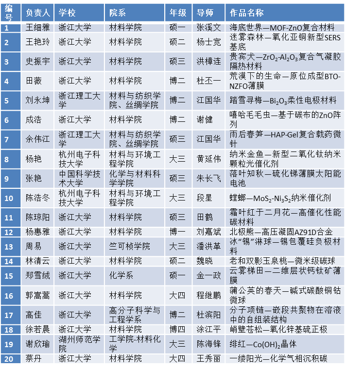 第八屆浙江省高校暨浙江大學(xué)材料微結(jié)構(gòu)探索大賽自2017年9月啟動(dòng)以來,得到了同學(xué)的廣泛關(guān)注和積極參與。本屆比賽共收到有效報(bào)名作品57件,經(jīng)過大賽組委會(huì)評(píng)委初審,20件優(yōu)秀作品入圍決賽答辯評(píng)審環(huán)節(jié)。現(xiàn)予以公示。(按姓氏筆畫排序)