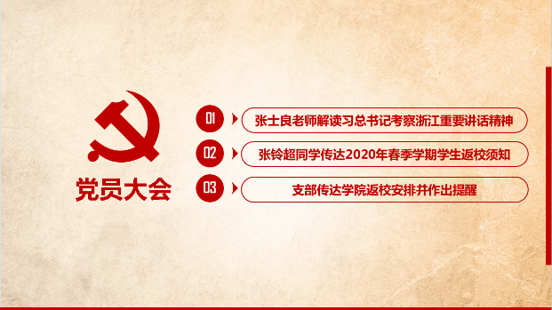 會議議程有:張士良老師解讀習(xí)總書記考察浙江重要講話精神、張鈴超同學(xué)傳達(dá)2020年春季學(xué)期學(xué)生返校須知、支部傳達(dá)學(xué)院返校安排并做出提醒、畢業(yè)生劉歡師兄發(fā)表臨別贈言。