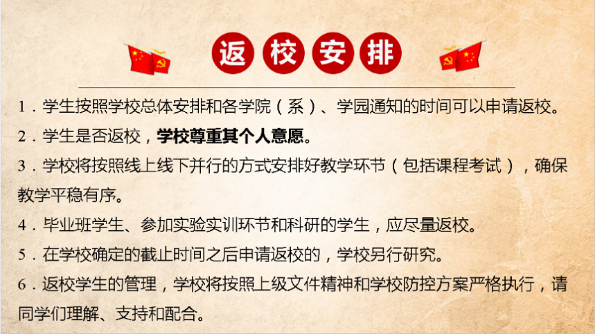 緊接著,張鈴超同志從返校時(shí)間安排、返校條件、返校申請等七個(gè)方面?zhèn)鬟_(dá)了關(guān)于2020年春季學(xué)期學(xué)生返校的通知及注意事項(xiàng)。高銘希同志就以上內(nèi)容作出了補(bǔ)充說明,并提醒同學(xué)們做好返校前的準(zhǔn)備、返校途中做好個(gè)人防護(hù)、返校后遵守學(xué)校的有關(guān)規(guī)定。未返校的同學(xué)們結(jié)合自身情況提出的疑問,也得到了確切的解答。