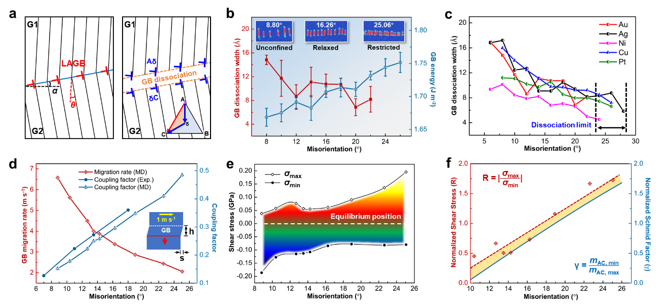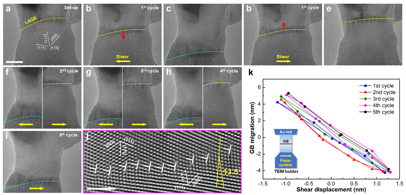 圖2. 小角晶界的分解與多周期循環(huán)剪切載荷下穩(wěn)定的往復(fù)遷移。