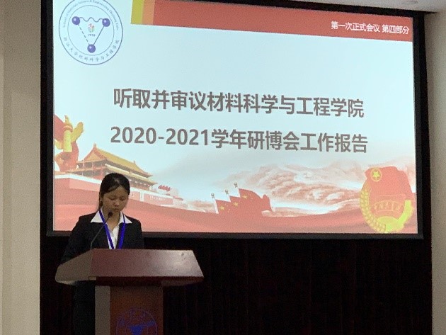 隨后,全體代表聽取并審議了姚悅作的2020-2021學(xué)年研博會(huì)工作報(bào)告。她回顧和總結(jié)過(guò)去一年的工作,材料學(xué)院研博會(huì)積極開展有關(guān)學(xué)術(shù)交流、求職就業(yè)、文化活動(dòng)、體育賽事、對(duì)外宣傳、對(duì)內(nèi)改革等工作,切實(shí)服務(wù)師生的工作和生活,但在工作傳承性、團(tuán)隊(duì)凝聚力、品牌影響力等方面仍存在努力空間,希望新一屆的研博會(huì)成員能繼承發(fā)揚(yáng)研博會(huì)優(yōu)良傳統(tǒng),改進(jìn)完善研博會(huì)的組織建設(shè)和活動(dòng)策劃。