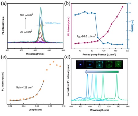 研究人員進(jìn)一步研究了鈣鈦礦薄膜的激射特性。結(jié)果表明,鈣鈦礦薄膜可在脈沖激光下實(shí)現(xiàn)較低閾值(99.6 μJ/cm2)的藍(lán)光放大自發(fā)輻射,并實(shí)現(xiàn)從綠光到藍(lán)光波段的連續(xù)調(diào)節(jié)。