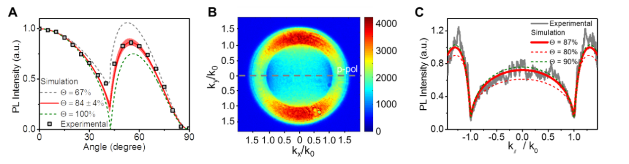 研究人員利用角度依賴光致發(fā)光光譜和傅里葉平面成像不同的方法表征了薄膜的躍遷偶極分布。相關(guān)結(jié)果表明:基于各向異性納米片的鈣鈦礦薄膜大幅度提升了水平方向的躍遷偶極比例(圖2)。