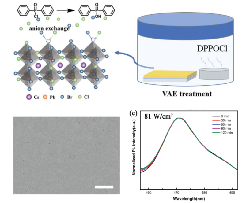 該工作開(kāi)發(fā)了一種簡(jiǎn)單的氣相離子交換法,為制備高表面質(zhì)量和光譜穩(wěn)定的氯溴混合鹵素鈣鈦礦薄膜、進(jìn)一步研發(fā)基于全無(wú)機(jī)鈣鈦礦薄膜的藍(lán)光LED乃至激光器件提供了新的思路。