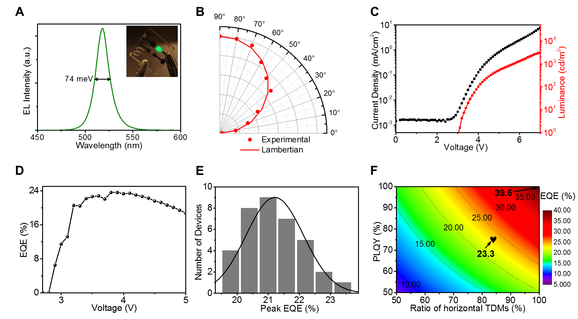 基于該高性能鈣鈦礦薄膜,制備了高效的PeLED,最高EQE可達(dá)到23.6%。通過(guò)采用經(jīng)典平面微腔結(jié)構(gòu)偶極模型,模擬結(jié)果顯示:在水平方向躍遷偶極比例為~84%、薄膜PLQY為~75%時(shí),器件的理論EQE最高為~23.3%,與實(shí)驗(yàn)數(shù)值基本吻合。根據(jù)此結(jié)果也可推測(cè):如果進(jìn)一步提升水平取向躍遷偶極比例和薄膜的PLQY,有望實(shí)現(xiàn)EQE超過(guò)30%的超高效PeLED。