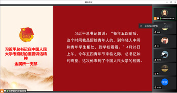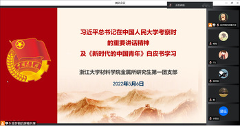 2022年5月6日浙江大學(xué)材料學(xué)院金屬所研究生第一團支部使用騰訊會議開展“習(xí)近平總書記在中國人民大學(xué)考察時的重要講話精神及《新時代的中國青年》白皮書學(xué)習(xí)”主題團課。