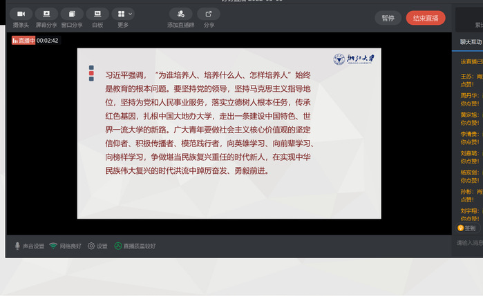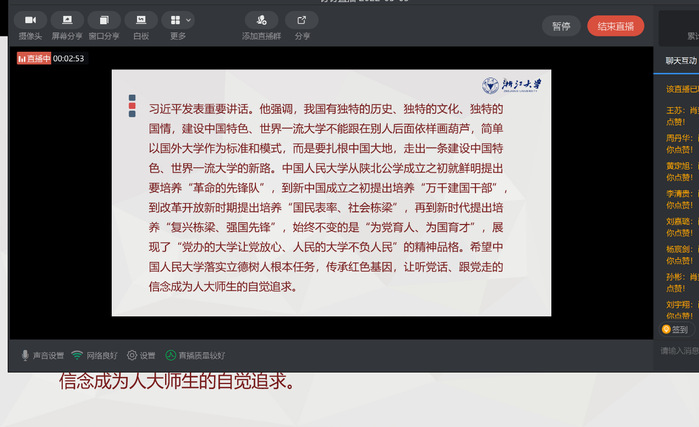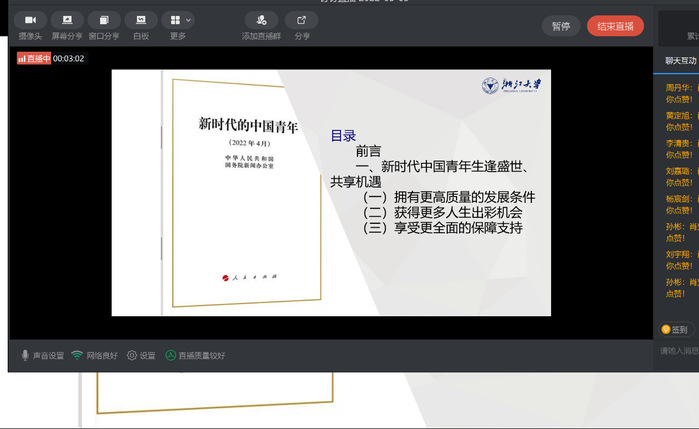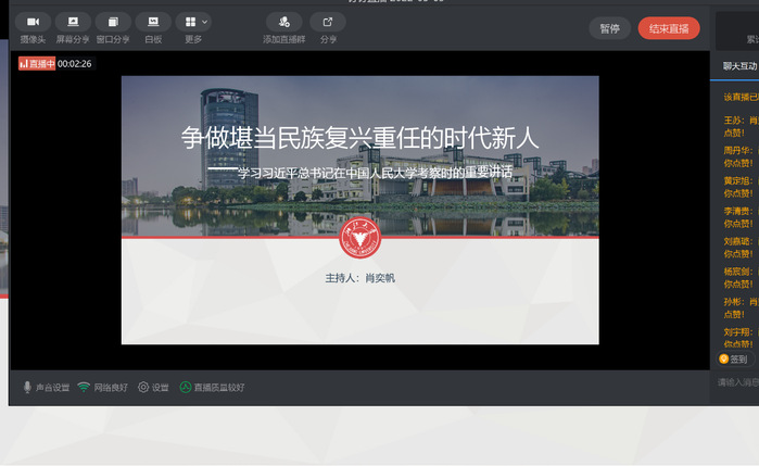 在五四青年節(jié)到來之際,習(xí)近平總書記來到中國人民大學(xué)考察,并深情寄語廣大青年。疫情的阻攔磨不滅青年心向黨的熱忱,5月4日,材料2001支部采取了釘釘線上會議的特殊方式,開展了學(xué)習(xí)習(xí)近平總書記在中國人民大學(xué)考察時的重要講話精神主題團(tuán)日活動,深刻領(lǐng)會習(xí)近平總書記重要講話精神,掀起學(xué)習(xí)熱潮。會議由團(tuán)支書肖奕帆同學(xué)主持。
