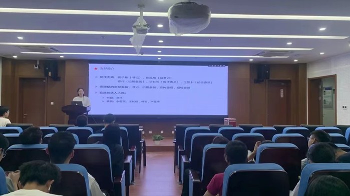 首先,進(jìn)行支部新生見面會。本次新學(xué)期支部新生見面會旨在幫助新生熟悉支部情況,融入新集體,提升支部凝聚力。無機(jī)三支部書記姜子瑋同志對支部的基本組成、運(yùn)行方式及所獲榮譽(yù)等情況進(jìn)行了介紹。無機(jī)三支部現(xiàn)有63名成員,其中共有黨員42人。