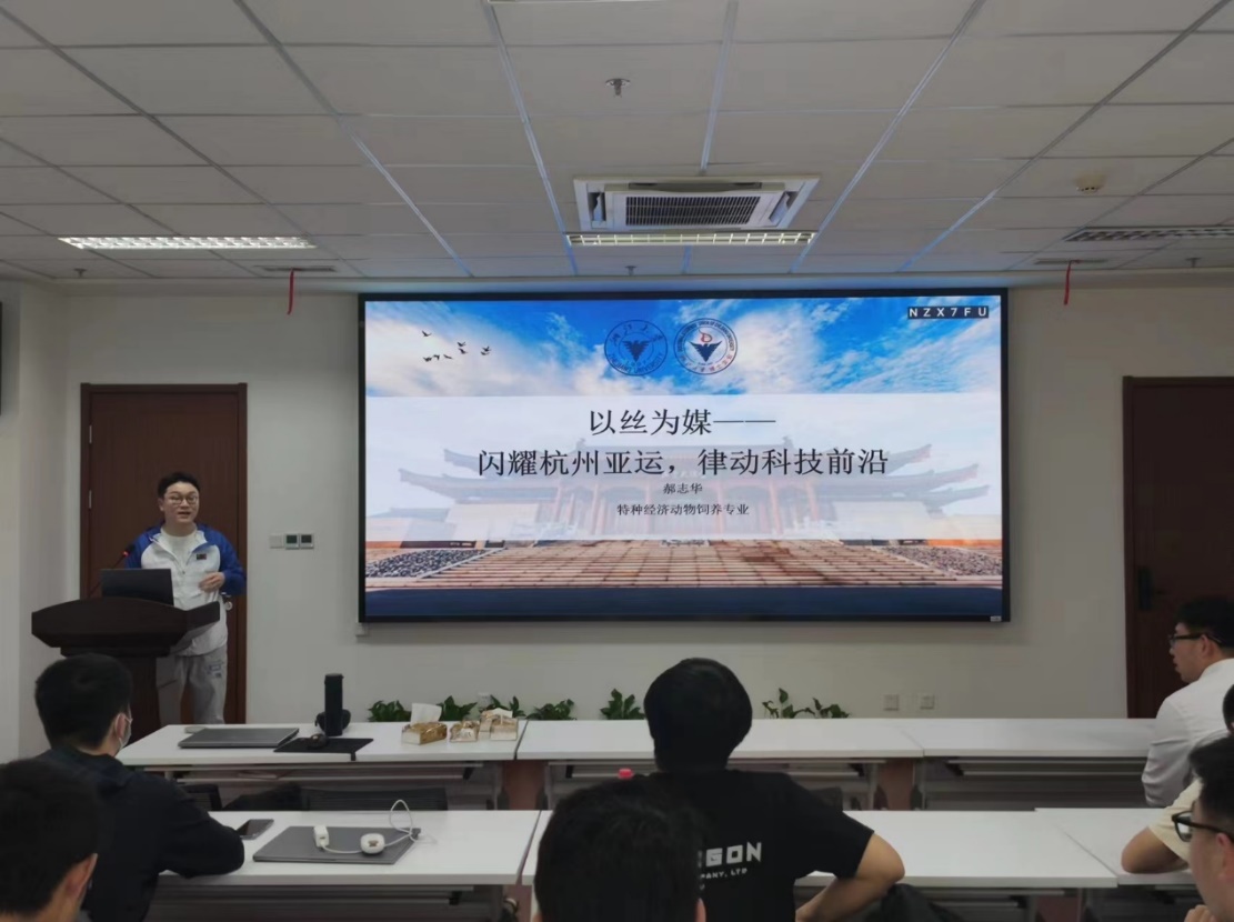 浙江大學博士生報告團講師、動物科學學院特種經(jīng)濟動物飼養(yǎng)專業(yè)2019級博士生郝志華以《以絲為媒——閃耀杭州亞運,律動科技前沿》的宣講。郝志華以絲綢為媒介,帶領大家一同走進杭州亞運會中蠶絲交織的光輝,結(jié)合個人研究方向介紹絲綢古今發(fā)展,啟迪臺下青年一輩的黨員同志們主動擔當,扛起產(chǎn)業(yè)興旺、鄉(xiāng)村振興、科技發(fā)展的責任,與中華文化一同璀璨。
