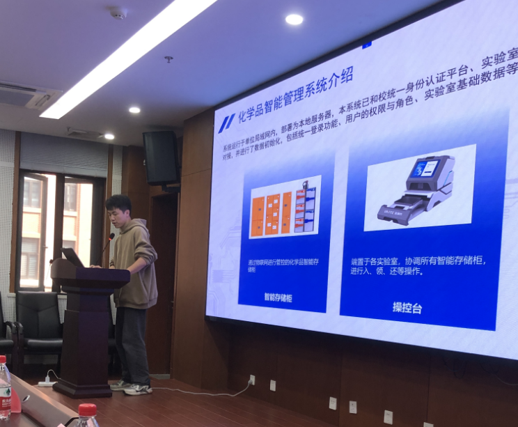 其次,為使師生更好地了解、使用智能試劑柜操作系統(tǒng),浙江優(yōu)納特科學儀器有限公司的周海峰工程師,從藥品入庫、領取、歸還和送處等環(huán)節(jié)進行了系統(tǒng)的培訓,使參會師生對智能柜系統(tǒng)的功能、操作與使用等有了進一步全面的了解。