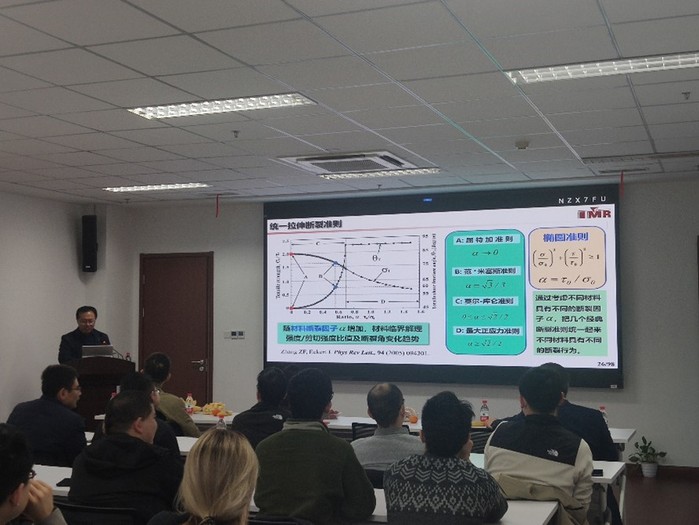 張哲峰研究員精彩的演講主要包括兩個(gè)主要部分:金屬玻璃的統(tǒng)一拉伸斷裂準(zhǔn)則和延性金屬的指數(shù)加工硬化模型。首先,張哲峰研究員就泰坦尼克號(hào)因船體斷裂沉沒(méi)事件引出高強(qiáng)度金屬材料的必要性。對(duì)金屬而言,實(shí)際理論強(qiáng)度與實(shí)驗(yàn)理論強(qiáng)度相差了近1000倍,Taylor等人提出了位錯(cuò)模型解決了這個(gè)問(wèn)題。同時(shí)介紹了經(jīng)典脆性斷裂理論(1638-1913年),但隨著科學(xué)前沿的發(fā)展,非晶合金的斷裂卻不符合經(jīng)典理論,非晶合金的拉伸斷裂角度大于45°,壓縮斷裂角度小于45°,張哲峰研究員查閱文獻(xiàn)經(jīng)過(guò)試驗(yàn)后得出如下結(jié)論:拉伸正應(yīng)力對(duì)剪切斷裂具有促進(jìn)作用,壓縮正應(yīng)力對(duì)剪切斷裂具有抑制作用。張哲峰研究員在此基礎(chǔ)上開(kāi)創(chuàng)性地提出橢圓準(zhǔn)則統(tǒng)一了經(jīng)典強(qiáng)度理論公式,提出材料斷裂因子α=τ0/σ0,并給出斷裂因子α的基本定義:材料純剪切強(qiáng)度與解理強(qiáng)度的比值。其中純剪切強(qiáng)度和解理強(qiáng)度是材料兩個(gè)獨(dú)立的力學(xué)性能參數(shù)。