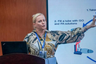 Daria Andreeva教授作了題為“Self-assembly of membranes – sustainable solutions for green technologies”的報(bào)告,介紹了關(guān)于催化性能膜自組裝的工作機(jī)理,以及它們?cè)谀茉春铜h(huán)境可持續(xù)發(fā)展方面的應(yīng)用。