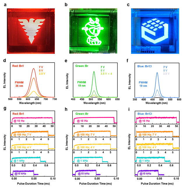 近日,Nature Electronics雜志在線發(fā)表了浙大材料學(xué)院葉志鎮(zhèn)院士團(tuán)隊(duì)微秒響應(yīng)鈣鈦礦有源矩陣顯示陣列創(chuàng)新成果,創(chuàng)新提出了類鹵素陰離子原位處理策略:在不破壞納米晶的基礎(chǔ)上實(shí)現(xiàn)了對(duì)CsPbBr3納米晶薄膜的單顆粒級(jí)鈍化處理,克服了鈣鈦礦納米晶薄膜缺陷難題。該策略抑制離子遷移從而提升LED響應(yīng)速度,并可進(jìn)一步拓展到藍(lán)光和紅光納米晶薄膜,國(guó)際首次實(shí)現(xiàn)了微秒響應(yīng)的鈣鈦礦三色有源矩陣顯示陣列。
