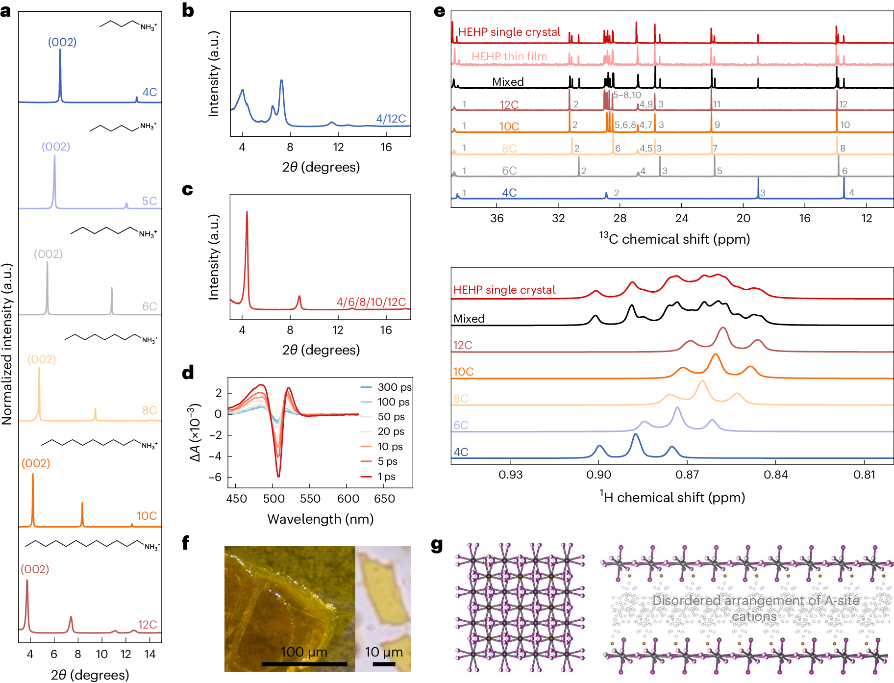 研究人員首先通過設(shè)計多種有機陽離子的混合,極大增加了材料的構(gòu)型熵,由此成功合成出一個由有序-無序混合的新型高熵結(jié)構(gòu)。在這種結(jié)構(gòu)中,無機鉛碘八面體骨架呈現(xiàn)出周期性的堆疊,而中間的有機層則表現(xiàn)出無序性。研究人員利用X射線衍射(XRD)和核磁共振(NMR)光譜等技術(shù)確認了材料的單相結(jié)構(gòu)和高熵特性。