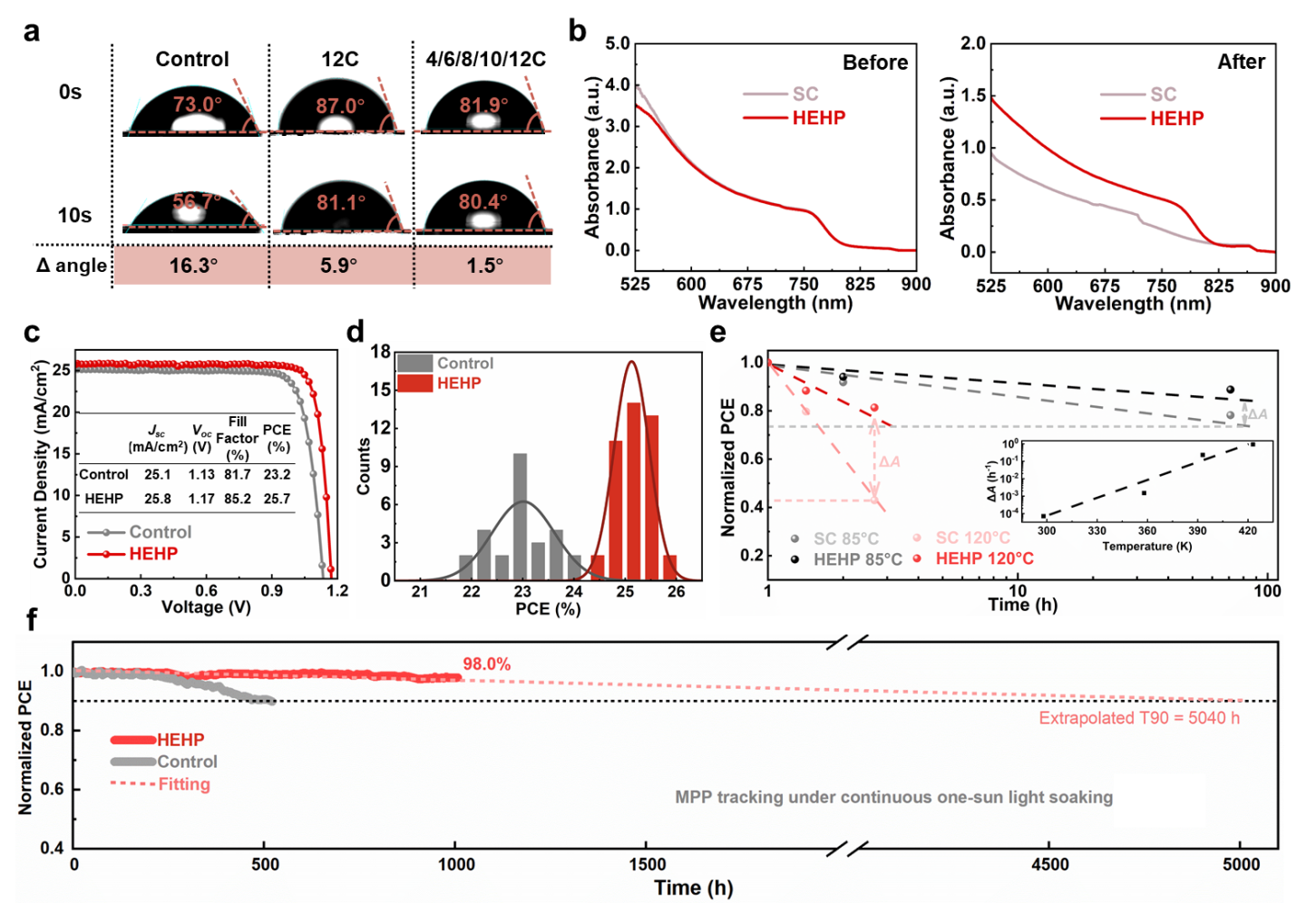 鑒于此,研究人員探索了有機組分在構(gòu)建高熵材料中的潛力,成功開發(fā)了一系列新型高熵有機-無機雜化鈣鈦礦材料。通過等摩爾量組裝擁有不同烷基鏈長的有機陽離子獲得了一種具有有序無機骨架和無序有機組分的雜化鈣鈦礦晶體結(jié)構(gòu),利用有機組分的高混亂度提高了該材料體系的熵。與單有機組分鈣鈦礦相比,這種高混亂度多有機組分的鈣鈦礦展現(xiàn)出了更優(yōu)越的性能。研究人員通過改變有機陽離子的組合系統(tǒng)地研究了影響這一類材料熵增的因素,并建立了相應(yīng)的理論模型。當將其應(yīng)用于鈣鈦礦太陽能電池中時,基于高熵雜化鈣鈦礦的光伏器件相較于單組份器件其性能顯著提高,能夠?qū)崿F(xiàn)25.7%(認證為25.5%)的光電轉(zhuǎn)換效率。在連續(xù)光照運行1000小時后,基于高熵鈣鈦礦材料的電池可保持超過98%的初始光電轉(zhuǎn)換效率,推算得出的T90壽命,可達5000小時以上。