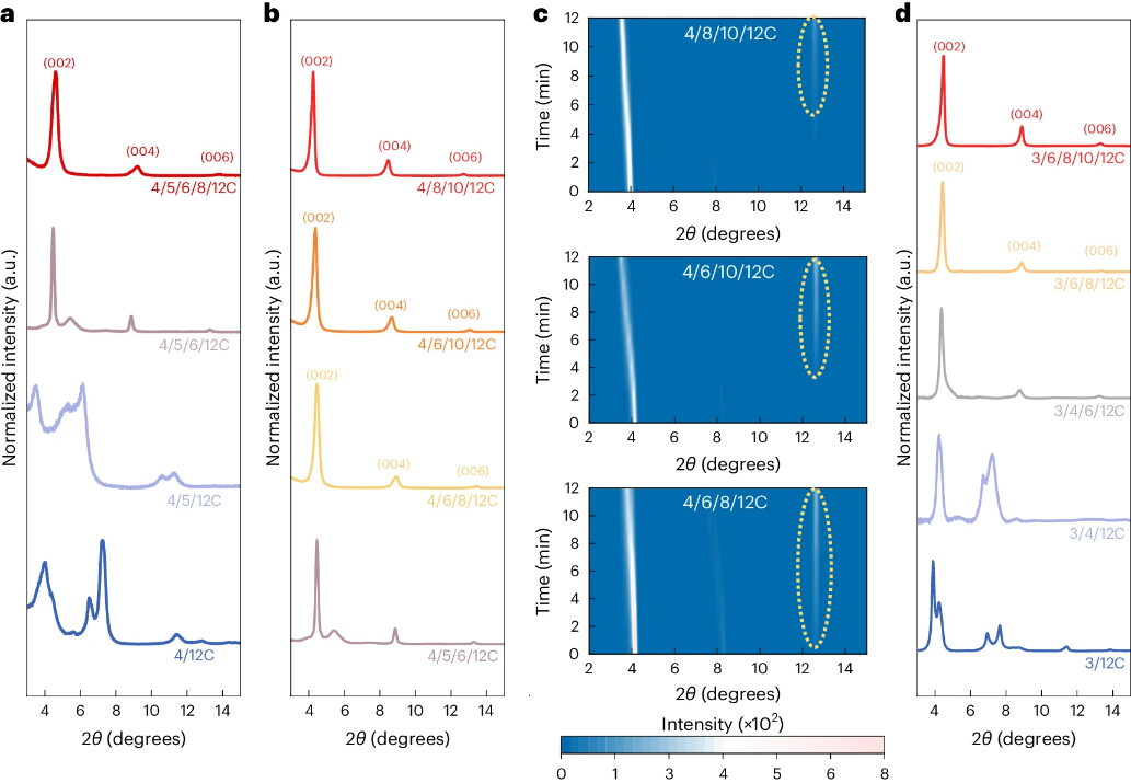 為了深入理解高熵雜化鈣鈦礦材料的熵增效應(yīng),研究人員系統(tǒng)性地考察了影響高熵鈣鈦礦體系熵增的因素。通過對擁有不同陽離子的數(shù)量和烷基鏈長度的鈣鈦礦薄膜進行X射線衍射分析,研究人員發(fā)現(xiàn)增加A位陽離子的數(shù)量和烷基鏈長度有助于提高體系的熵值和相穩(wěn)定性。
