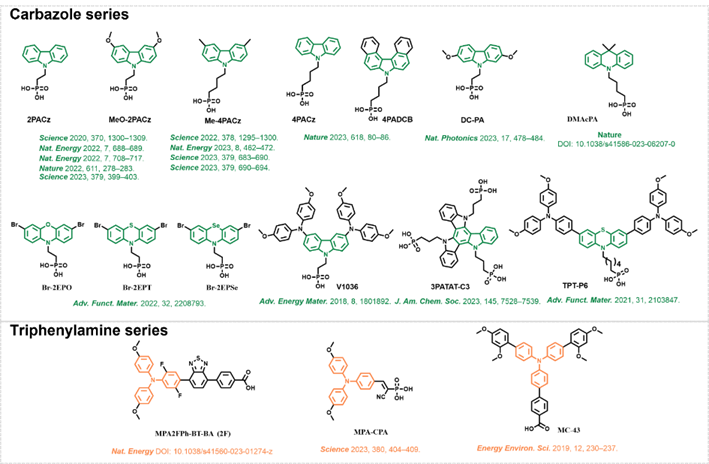 圖1. 已報(bào)道的基于雜原子共軛母核的空穴選擇接觸層材料的分子結(jié)構(gòu)總結(jié)