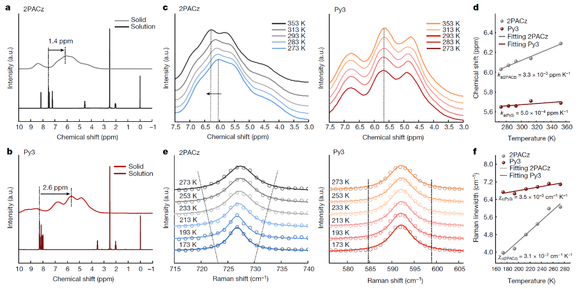 同時,研究表明Py3的分子組裝具有很強(qiáng)的結(jié)構(gòu)剛性。 如圖2E所示,2PACz薄膜在外部加熱作用下表現(xiàn)出了不穩(wěn)定的堆積方式,而Py3自組裝形成的堆積結(jié)構(gòu)則在加熱前后保持幾乎不變(圖2F)。固態(tài)核磁共振光譜分析表明,Py3分子共軛核心間具有更強(qiáng)的π-π相互作用。我們使用變溫固態(tài)核磁共振光譜和變溫拉曼光譜揭示了其顯著增強(qiáng)的分子堆積結(jié)構(gòu)剛性(圖3)。