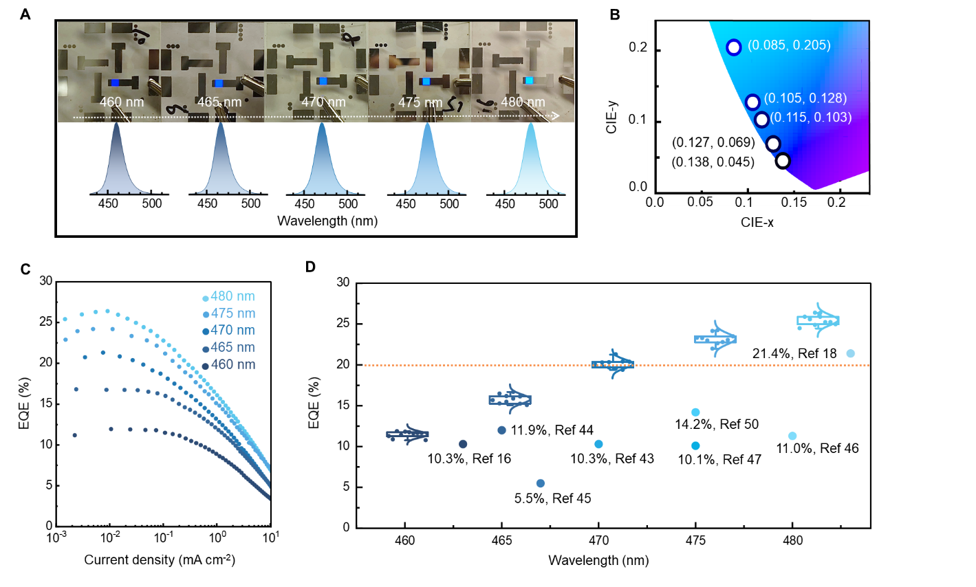 研究團(tuán)隊(duì)以不同時(shí)間尺度下的光譜觀察了氯含量與氯缺陷及材料光學(xué)性能之間的變化與聯(lián)系,得出氯含量與納米晶薄膜中缺陷及熒光量子產(chǎn)率呈負(fù)相關(guān)的定性關(guān)系,并提出一條提升藍(lán)光LED器件性能的關(guān)鍵思路,即降低氯含量來抑制氯缺陷。通過A位銣補(bǔ)償策略,在保證CsPbBrxCl3-x納米晶發(fā)光波長沒有偏移的情況下有效降低了氯含量,明顯抑制了缺陷,提升納米晶光學(xué)性能。團(tuán)隊(duì)基于含銣納米晶制備的鈣鈦礦藍(lán)光LED器件在顯示需要的波段下均實(shí)現(xiàn)了更高的器件效率,特別是480nm的器件效率達(dá)到了26.4%,是截止目前鈣鈦礦藍(lán)光LED器件中的最高效率。