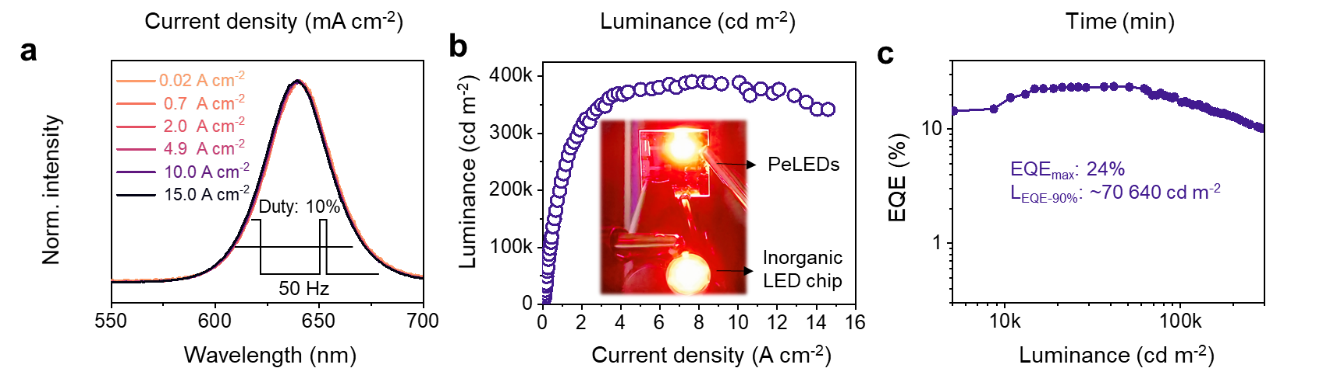 研究團(tuán)隊(duì)開發(fā)了控制納米晶薄膜發(fā)光層的焦耳熱生成和增強(qiáng)器件散熱的協(xié)同策略。通過磷酸二苯酯對納米晶進(jìn)行表面調(diào)控,提升納米晶薄膜的光學(xué)性能和載流子傳輸性能,結(jié)合高導(dǎo)熱率的藍(lán)寶石襯底以及脈沖模式驅(qū)動(dòng),實(shí)現(xiàn)了近40萬尼特的超高亮度LED,比報(bào)道的器件高出兩個(gè)數(shù)量級,并在高電流密度(15 A cm?2)范圍內(nèi)保持出色的光譜穩(wěn)定性,達(dá)到與無機(jī)LED相近的結(jié)果。該項(xiàng)研究強(qiáng)調(diào)了熱管理策略在推進(jìn)高性能鈣鈦礦LED中的重要性,研究結(jié)果表明,增強(qiáng)納米晶的光電特性有助于減少焦耳熱的產(chǎn)生,有效的散熱器集成和充足的散熱有助于器件內(nèi)的有效熱管理,最終實(shí)現(xiàn)高性能器件。超高電流密度下鈣鈦礦量子點(diǎn)器件所展現(xiàn)的超高亮度和穩(wěn)定性給高功率鈣鈦礦基器件的發(fā)展奠定了基礎(chǔ)。