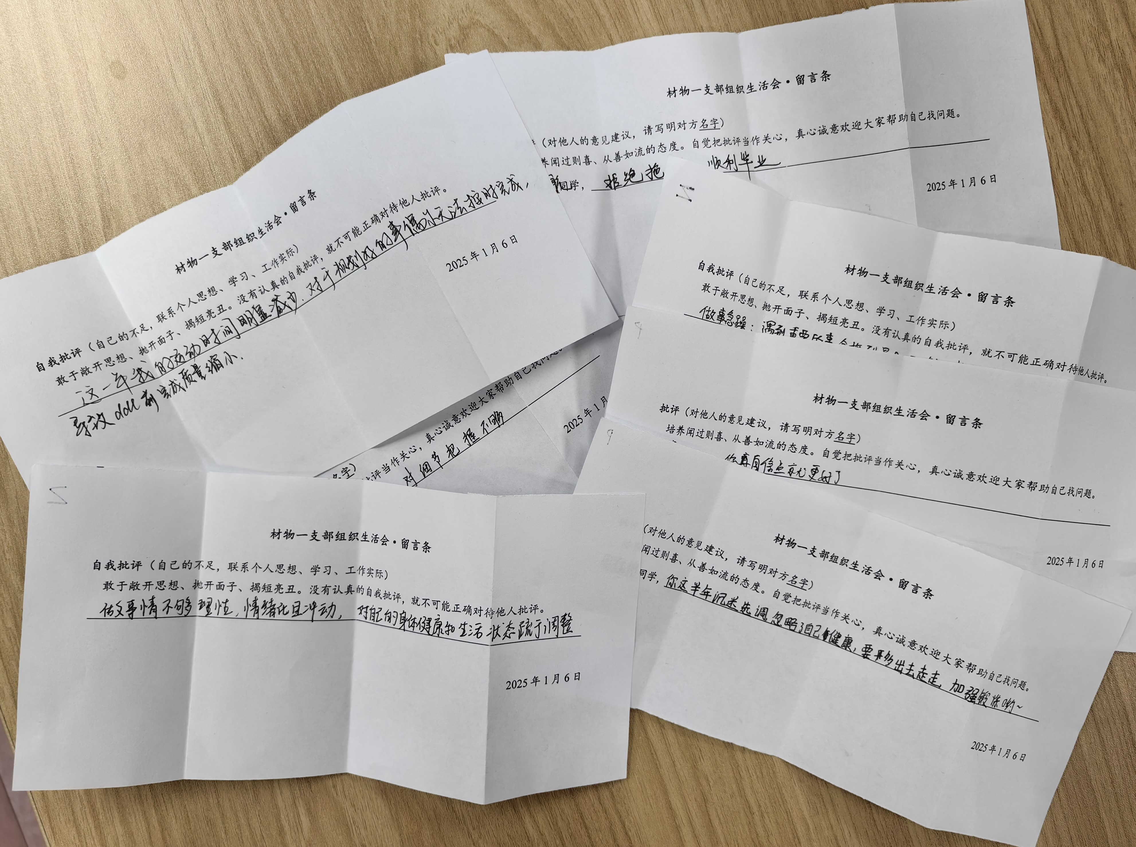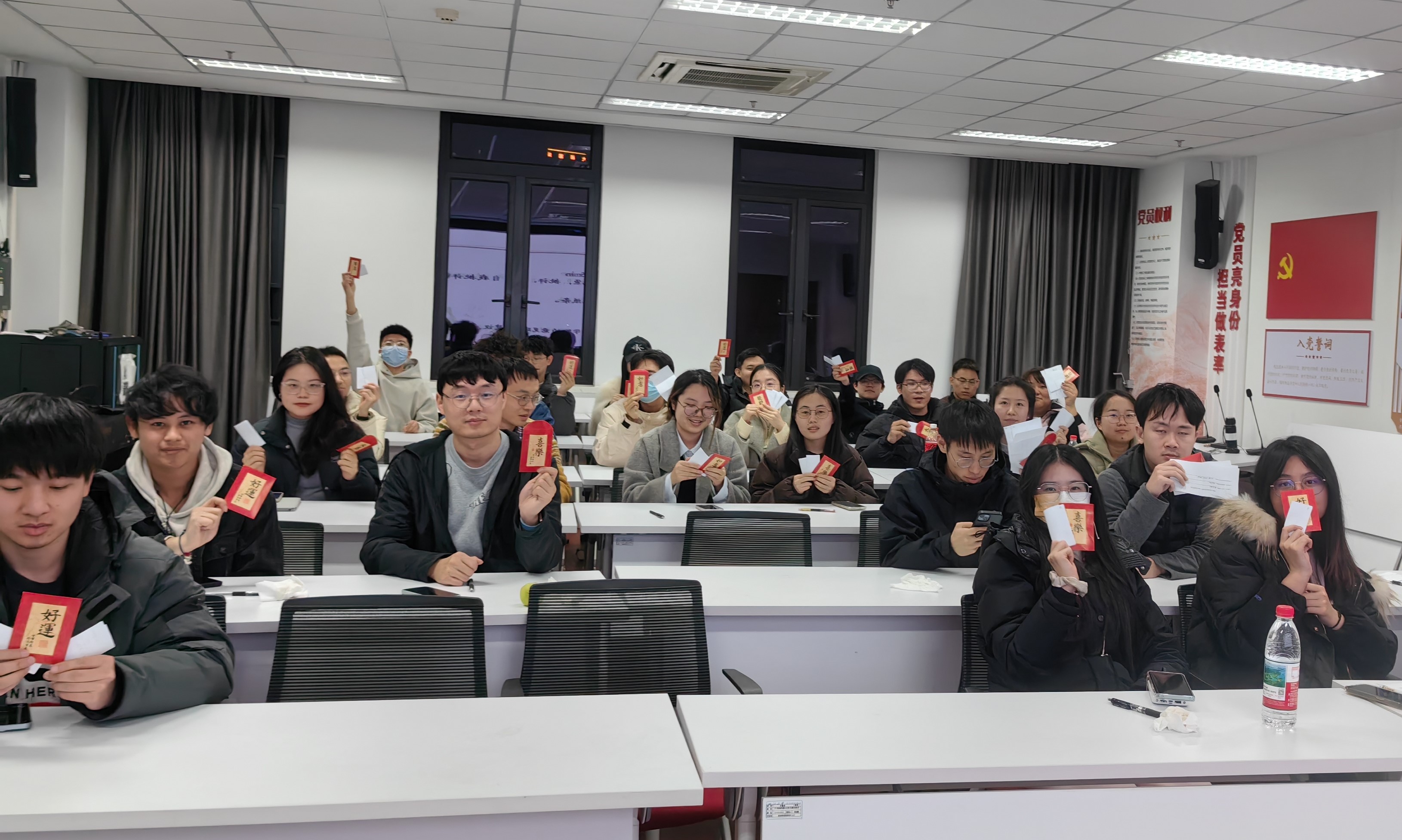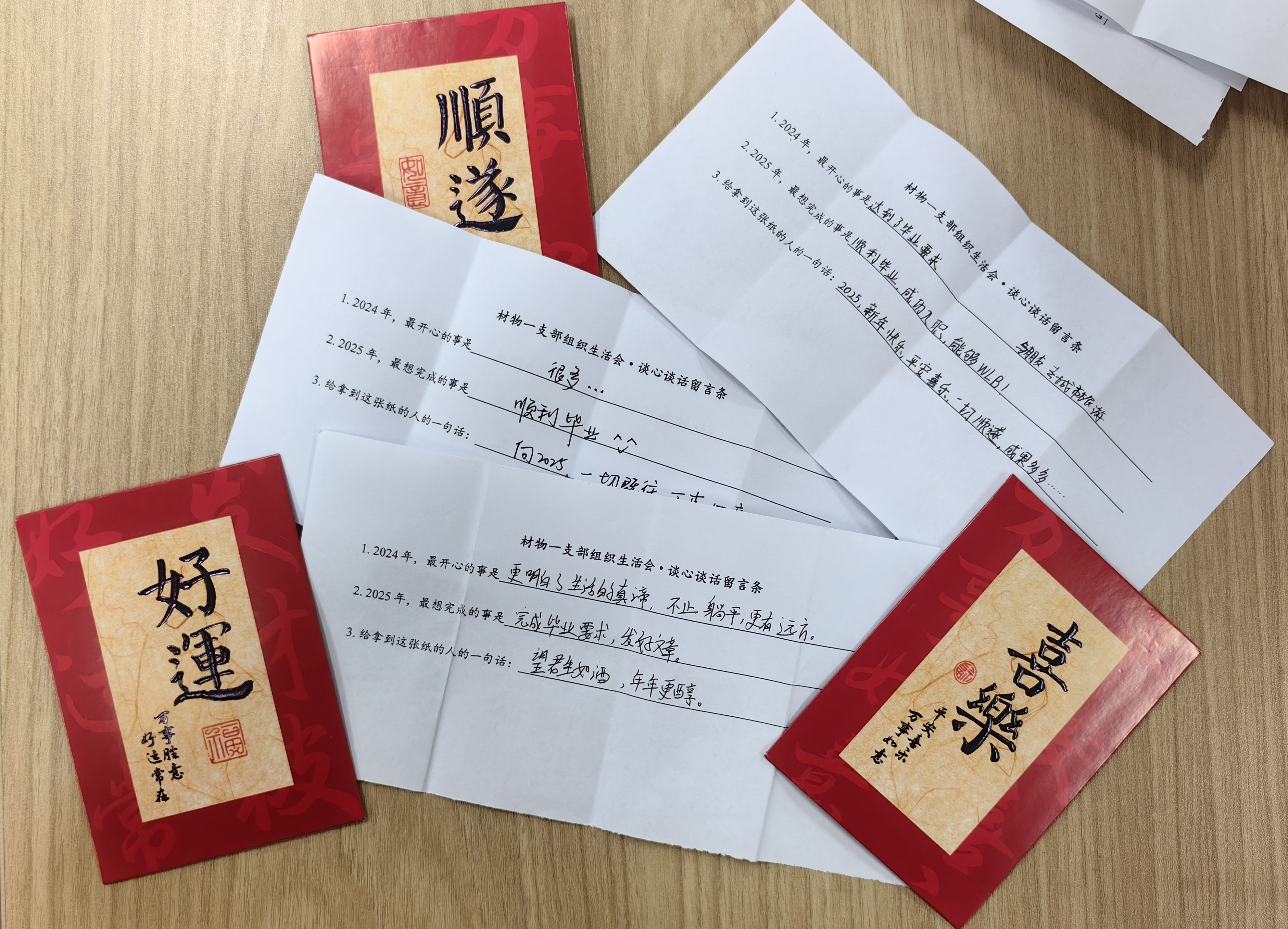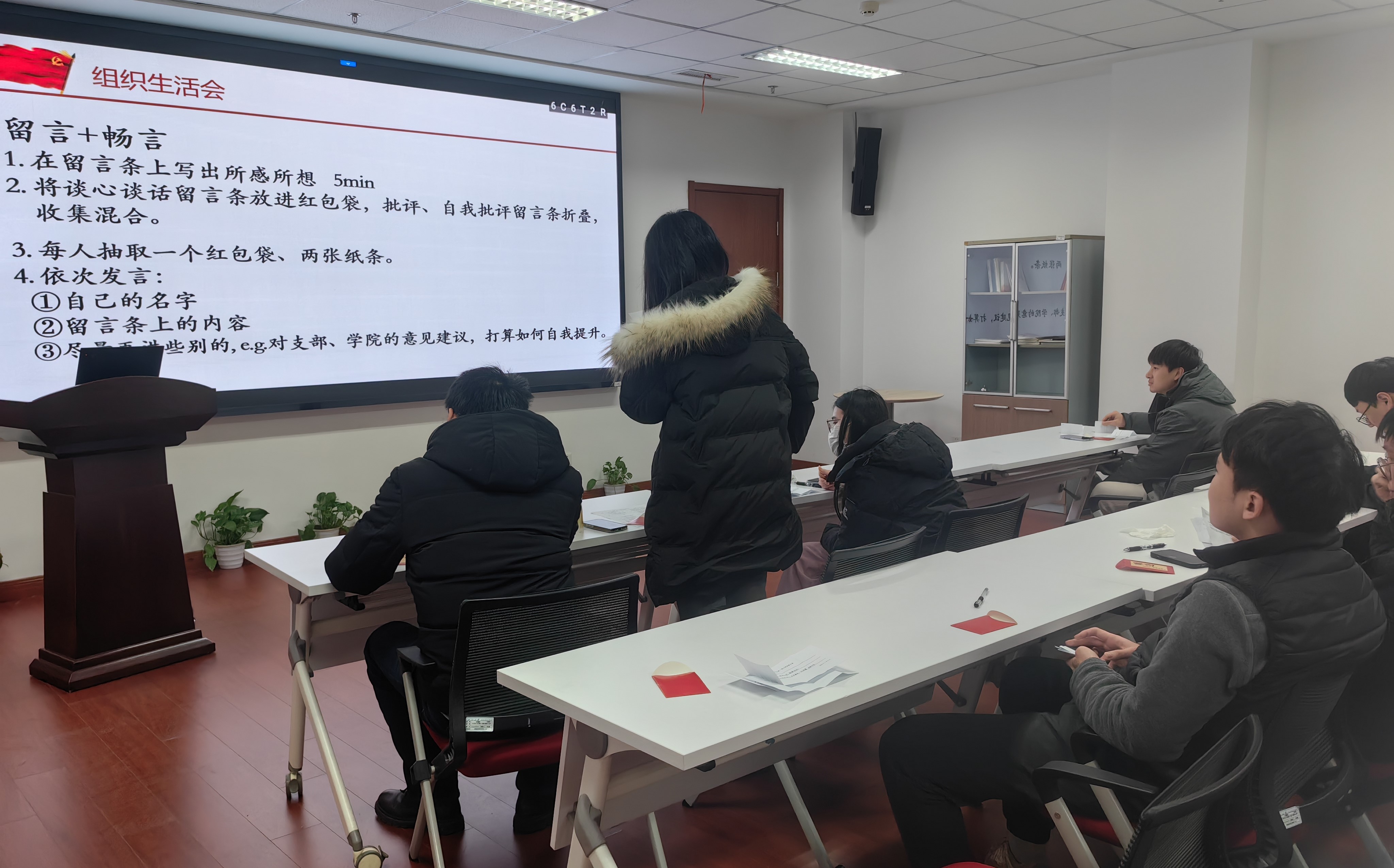 接著,支部開展了組織生活會(huì)和民主評(píng)議黨員。為了促進(jìn)大家敞開心扉地交流,這次組織生活會(huì)采用了“留言+暢言”的方式。每人先拿到一個(gè)紅包袋,里面裝著“談心談話”留言條,寫好后裝入紅包袋,再放進(jìn)箱子中,之后組織委員陳周萍和宣傳委員李文彪請(qǐng)同志們隨機(jī)抽取紅包袋。每人也拿到了“批評(píng)”留言條和“自我批評(píng)”留言條,大家寫好后分別交給支書王茜和紀(jì)律委員朱開琦,混合之后請(qǐng)大家隨機(jī)抽取。現(xiàn)場(chǎng),大家熱情參與。抽取完三張寫字的留言條之后,同志們輪流發(fā)言:先說出自己的名字、念出留言條上的內(nèi)容,再自由發(fā)揮、暢所欲言。發(fā)言過程中,同志們掌聲不斷,時(shí)而歡聲笑語(yǔ),時(shí)而嚴(yán)肅認(rèn)真。有文藝版祝福“望君生如酒,年年更醇”,也有接地氣版祝福“新年快樂,成果多多”;有批評(píng)自己易沖動(dòng)的,有批評(píng)他人科研不夠認(rèn)真的,還有批評(píng)支部開會(huì)辦活動(dòng)總有很多人遲到的。同志們發(fā)現(xiàn),大家都是很關(guān)心彼此的,也都很真心誠(chéng)意歡迎他人幫助自己找問題。大家紛紛表示,未來會(huì)勇于提意見,認(rèn)真查擺問題,努力改正、進(jìn)步。