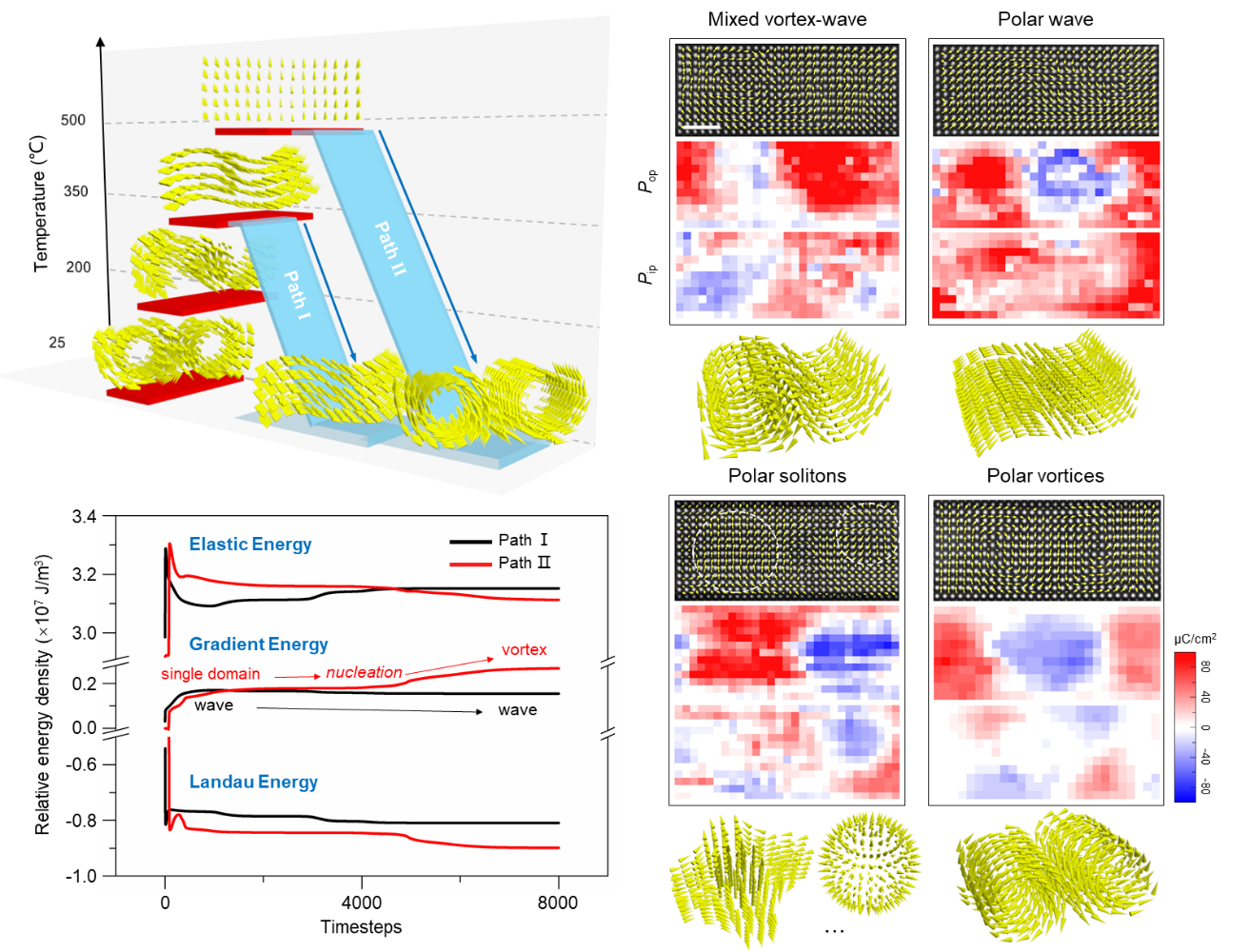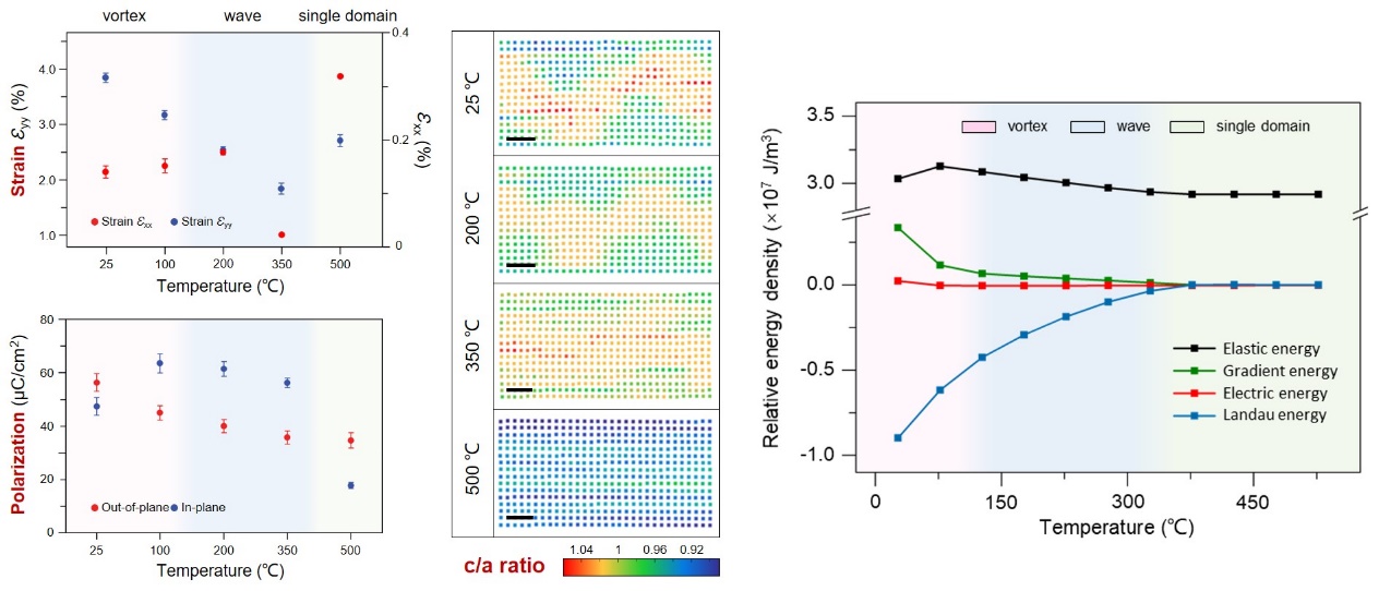 “隨著溫度變化,體系的應(yīng)變、極化和晶格都呈現(xiàn)非單調(diào)性的變化。這意味著不同參量間不僅相互競(jìng)爭(zhēng),且共同主導(dǎo)著鐵電拓?fù)湎嘧冞^(guò)程”,童沛然博士說(shuō),“這些參量變化的奇異點(diǎn)也對(duì)應(yīng)著拓?fù)湎嗟霓D(zhuǎn)變點(diǎn)。”論文的共同通訊作者,浙江大學(xué)材料科學(xué)與工程學(xué)院洪子健研究員通過(guò)相場(chǎng)模擬也發(fā)現(xiàn),在鐵電拓?fù)湎嘧冞^(guò)程中,系統(tǒng)的彈性能、朗道能、梯度能等能量均隨著溫度產(chǎn)生變化。