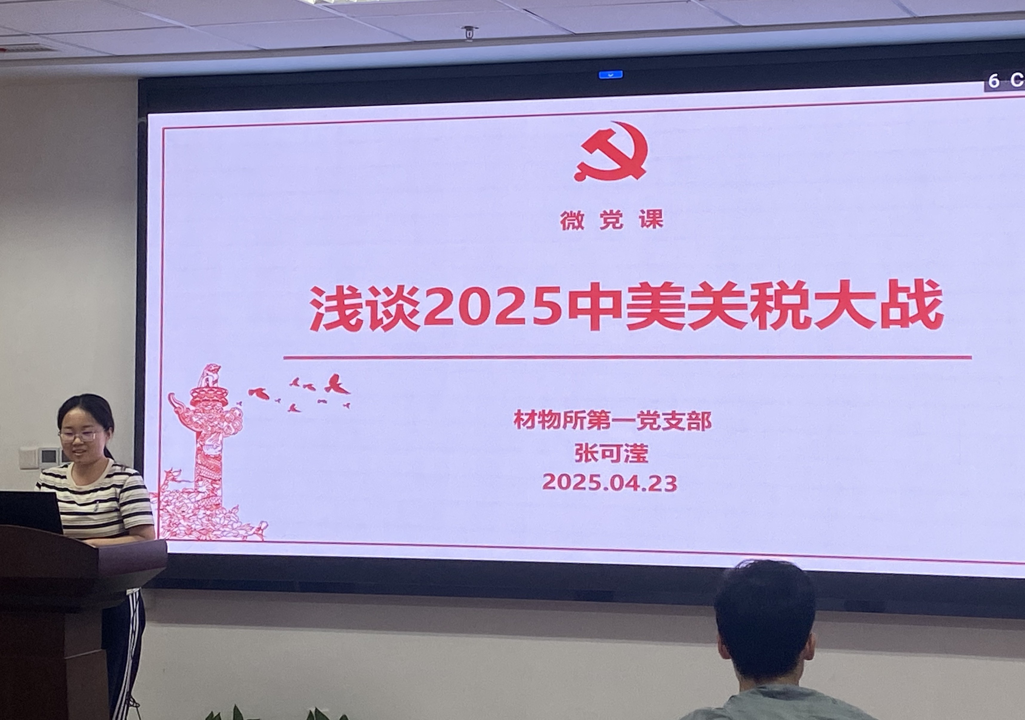 首先是支部的一人一課微黨課環(huán)節(jié)。張可瀅同志以“淺談2025中美關(guān)稅大戰(zhàn)”為主題,分享了自己對這個熱點話題的看法。張可瀅同志為大家梳理了這一事件的背景、發(fā)展經(jīng)過和重要的時間節(jié)點,并在此基礎(chǔ)上分析了關(guān)稅大戰(zhàn)的本質(zhì)以及中國的應(yīng)對策略。同志們對這一話題也頗有關(guān)注,客觀完整又簡潔的分析,正好契合了同志們的關(guān)切。她分享到,關(guān)稅大戰(zhàn)的本質(zhì)一方面是美國為了減少貿(mào)易逆差、倒逼制造業(yè)回流等,也就是國內(nèi)政治需求;另一方面是美國為了遏制中國技術(shù)和經(jīng)濟的發(fā)展,但關(guān)稅戰(zhàn)“傷敵一千自損八百”,這里面是沒有贏家的。不過,在這場競爭中,中國有自己的應(yīng)對策略和底氣。中國采取“談判、合作+尋找新市場”的策略。中國具有長期的戰(zhàn)略準(zhǔn)備:市場上“一帶一路”,分散貿(mào)易依賴,拉動內(nèi)需,技術(shù)上“中國制造2025”;具有經(jīng)濟杠桿與反制措施:掌握稀土資源,突破技術(shù)壁壘,貿(mào)易“去美元化”;還具備地緣政治優(yōu)勢與外交決心。那些打不倒我們的,只會讓我們更強大。在勤勞勇敢的中國人民面前,任何絆腳石都將被變成墊腳石。大家紛紛點頭鼓掌。