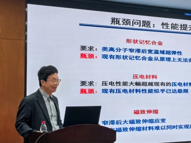 報告伊始,任曉兵教授結(jié)合類比了人的大腦感知外界環(huán)境驅(qū)動向我們介紹了可以感知力、電、磁、溫度等外場并產(chǎn)生驅(qū)動(位移等)的三類鐵性智能功能材料:包含鐵彈/形狀記憶合金,鐵電壓電材料,鐵磁磁致伸縮材料,他們都符合同一Landau物理框架。而如今智能技術(shù)的高速發(fā)展背景對智能材料性能提出了前所未有的高要求,基于傳統(tǒng)原理的性能提升普遍遭遇到原理性瓶頸,亟待發(fā)現(xiàn)能夠突破當前原理性瓶頸的新原理,進而獲得智能材料的性能突破。