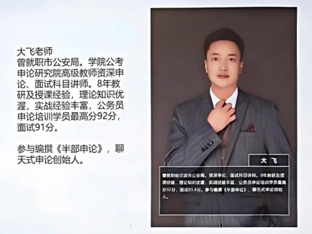 大飛老師曾就職市公安局。學(xué)院公考申論研究院高級教師資深申論、面試科目講師。8年教研及授課經(jīng)驗(yàn),理論知識優(yōu)渥,實(shí)戰(zhàn)經(jīng)驗(yàn)豐富。